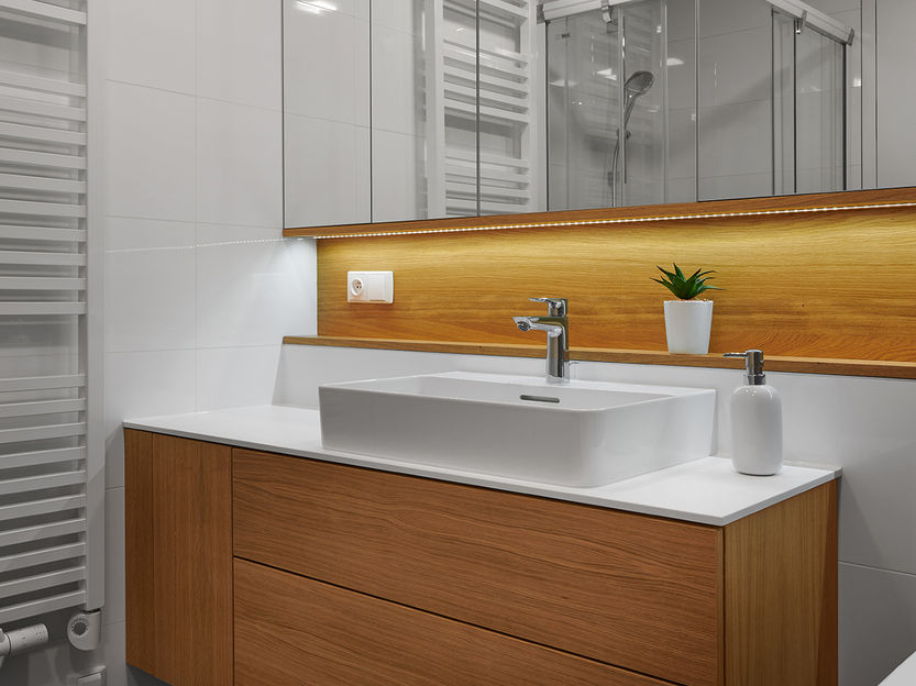 Tento moderní interiér bytu je postaven na kombinací přírodních materiálů a bílého dekoru. Vyniká krásným netypickým obkladem kuchyňské linky umělým kamenem. Důraz je kladen především na kvalitu zpracování a kombinaci přírodního dubu, umělého kamene a matného bílého LTD dekoru.